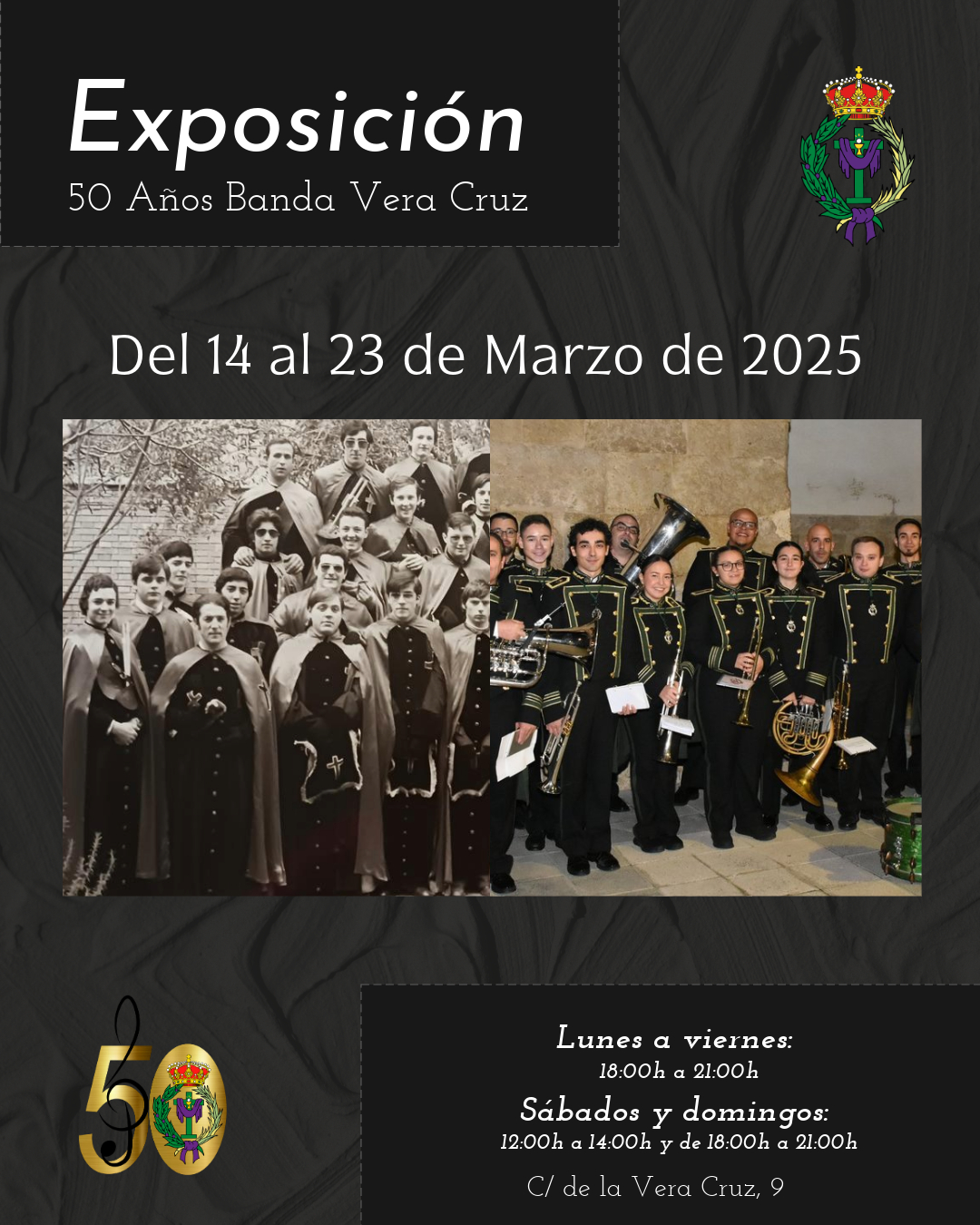 Desde el viernes 14 de marzo hasta el domingo 23 de marzo, la Cofradía de la Vera Cruz acogerá una exposición conmemorativa por el 50 aniversario de nuestra agrupación musical.