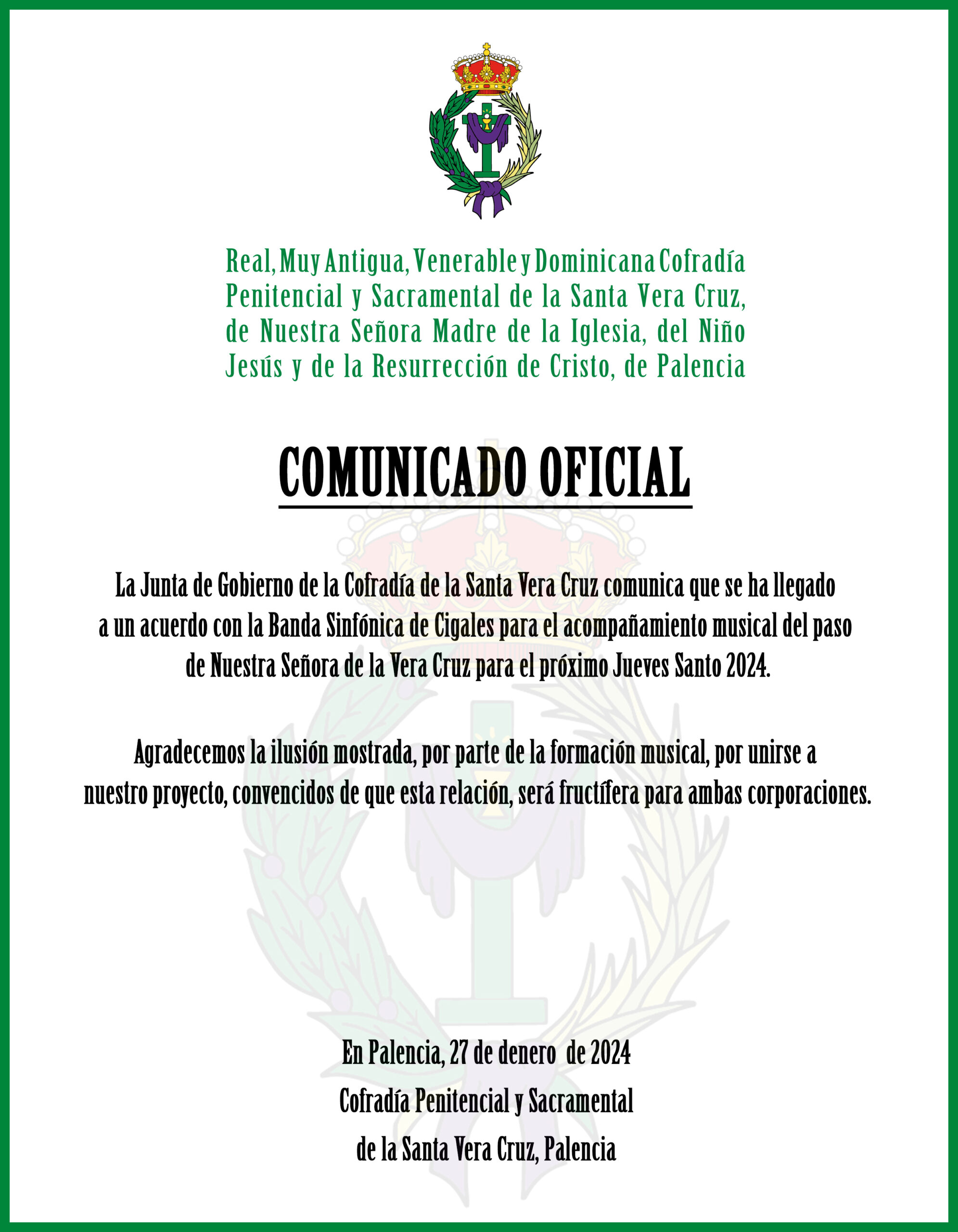 Desde la Cofradía de la Vera Cruz de Palencia hemos llegado a un acuerdo con la Banda Sinfónica de Cigales para su acompañamiento durante el Jueves Santo, en la Procesión de la Oración del Huerto.