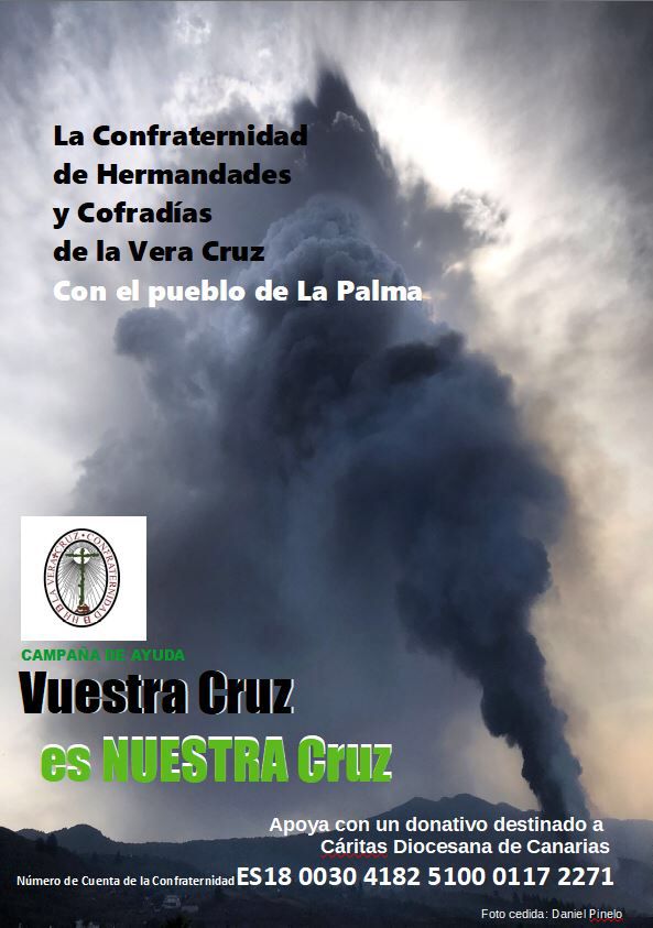 Con el lema “Vuestra Cruz es nuestra Cruz. La Confraternidad de Hermandades y Cofradías con el pueblo de La Palma”, inicia una campaña solidaria para ayudar a las familias damnificadas a causa del volcán canario que lleva más de una semana en erupción y que ha arrasado con centenares de hogares y negocios.