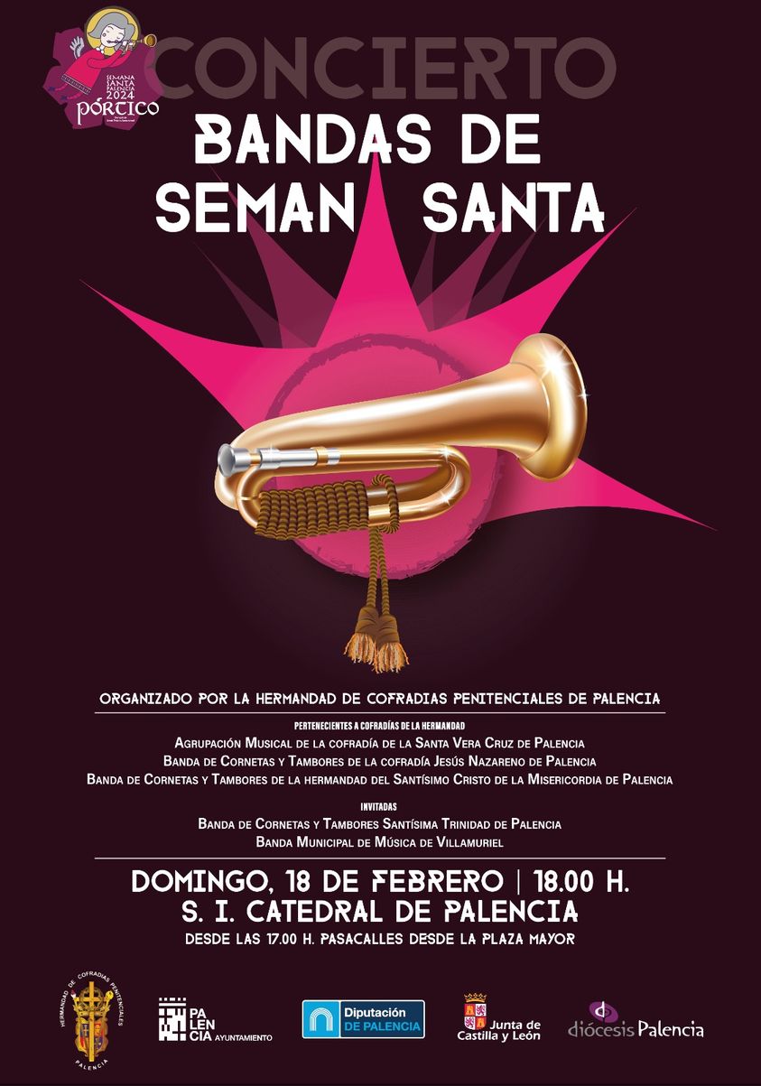 Mañana domingo, 18 de febrero del 2024 a las 18:00h, en la Santa Iglesia Catedral de Palencia, la Agrupación Musical de la Santa Vera Cruz, participará en el concierto “Bandas de Semana Santa”, organizado por la Hermandad de Cofradías de Palencia.