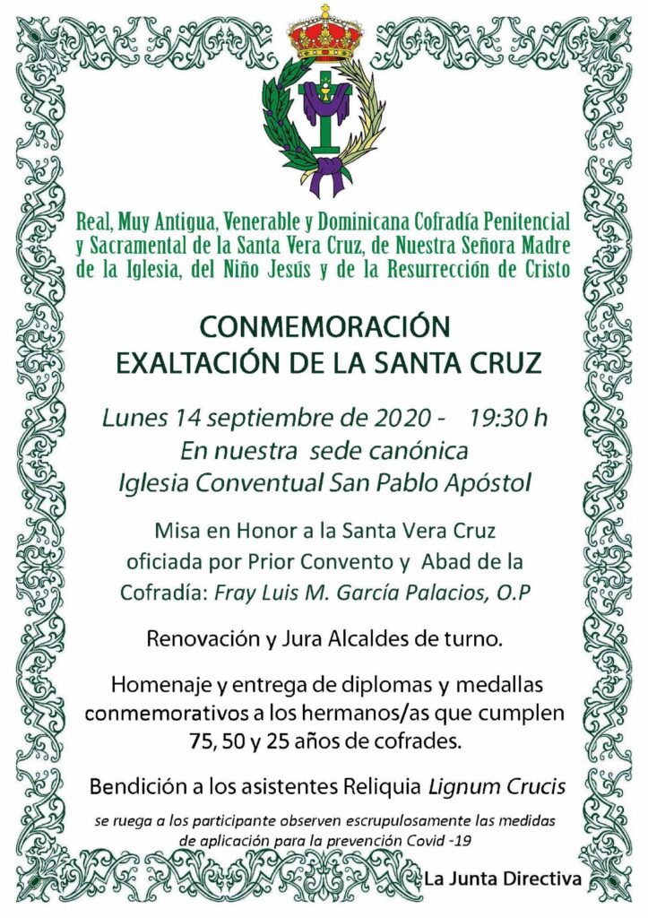 El lunes 14 de septiembre de 2020 a las 19:30 h. en nuestra sede canónica Iglesia Conventual de San Pablo Apóstol, tendrá lugar la misa en Honor a la Santa Vera Cruz.
