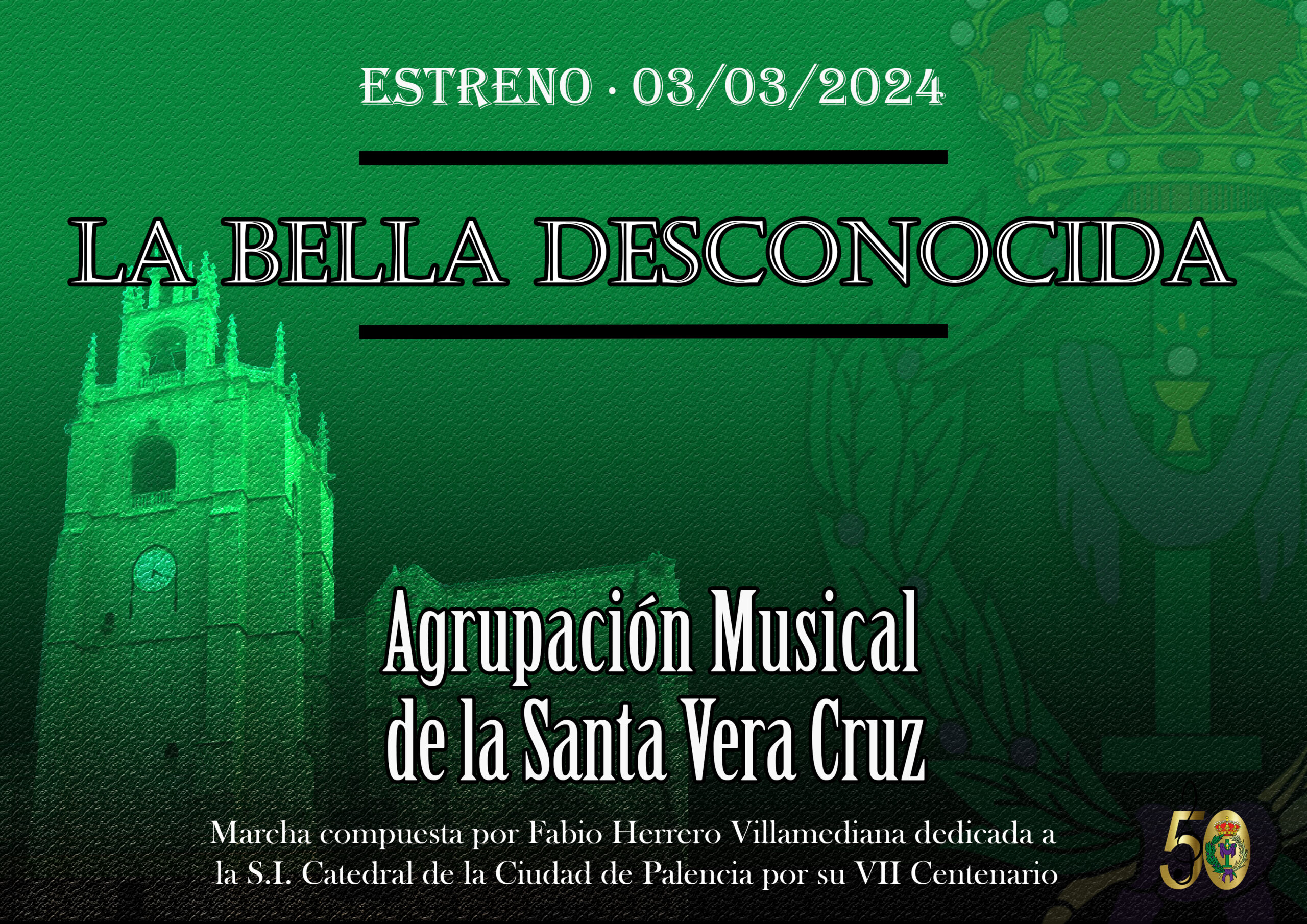 En el mismo la Agrupación estrenará la marcha “La Bella Desconocida”, por el 50 Aniversario de la Agrupación Musical que cumple este año, compuesta por Fabio Herrero Villamediana dedicada a la S.I. Catedral de Palencia por su VII Centenario.