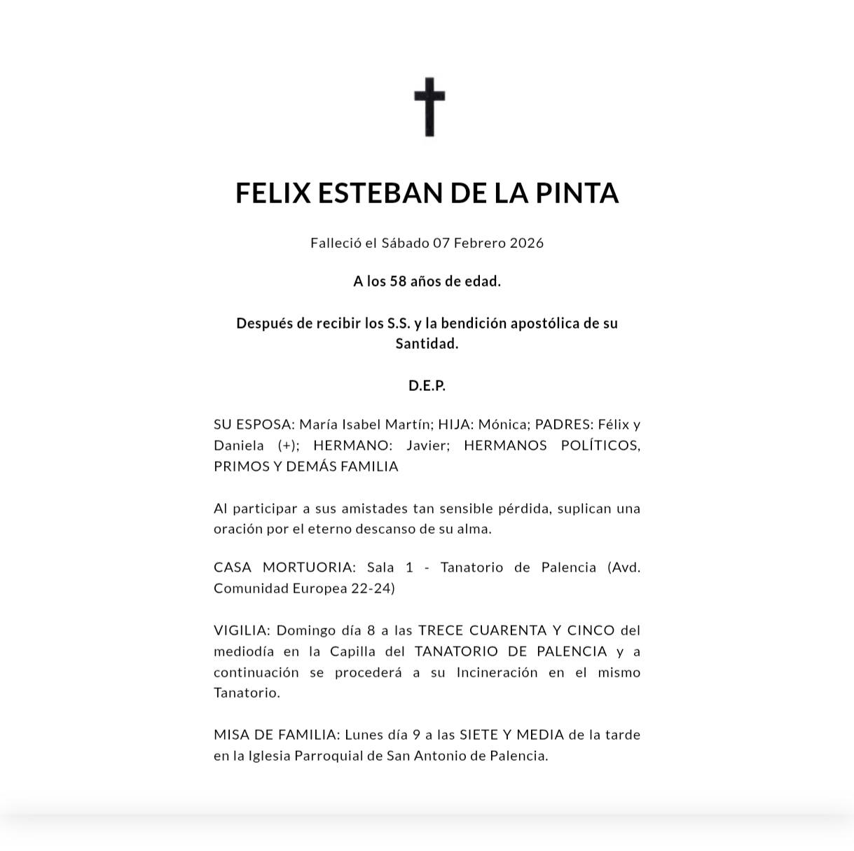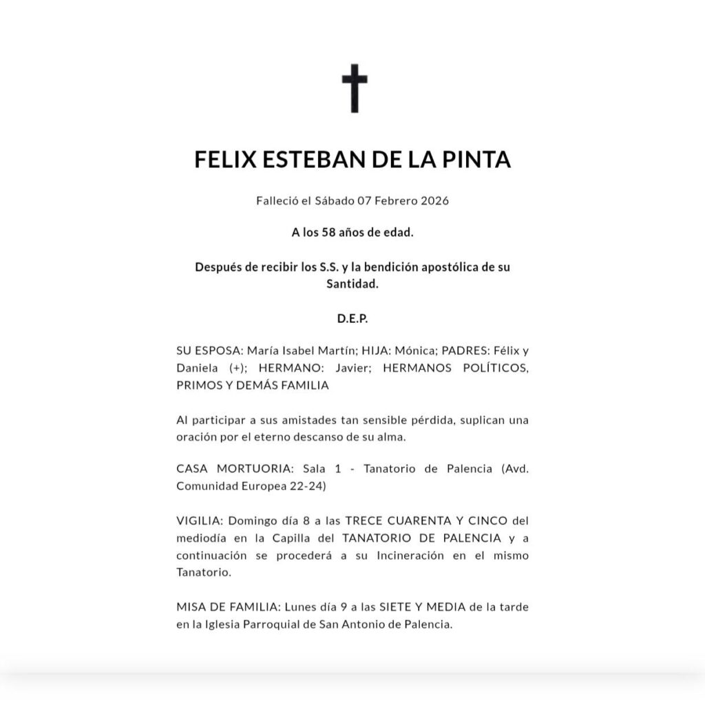 Con profundo pesar, comunicamos el fallecimiento de Don Félix Esteban De la Pinta, en el día de hoy, día 7 de febrero del 2026.