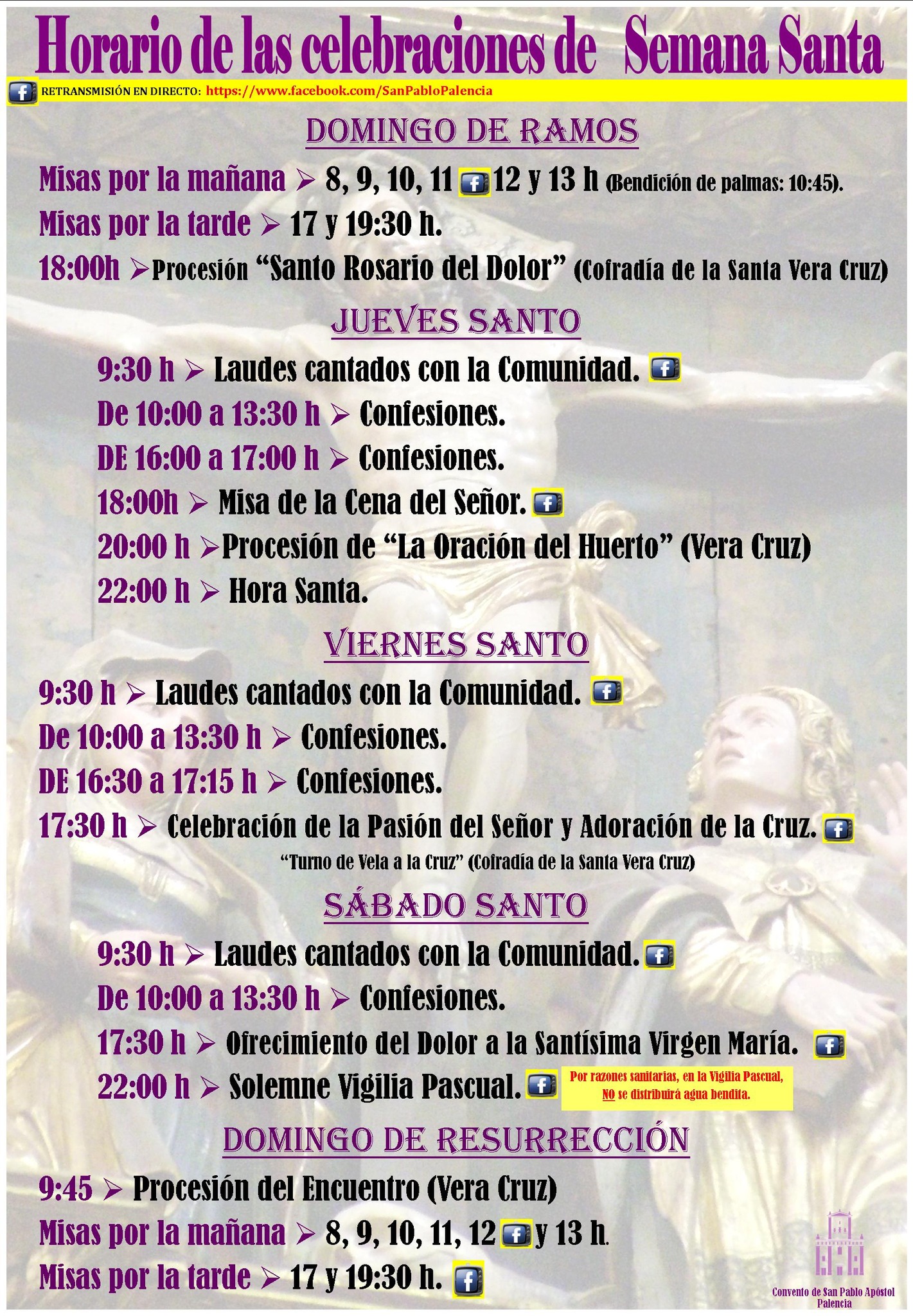 Con el fin de facilitar el seguimiento de las celebraciones, en este cartel general que os adjuntamos, y en los que iremos subiendo cada día, podréis comprobar, mediante el correspondiente dibujo, cuáles se retransmitirán en directo a través de nuestro canal de Facebook.