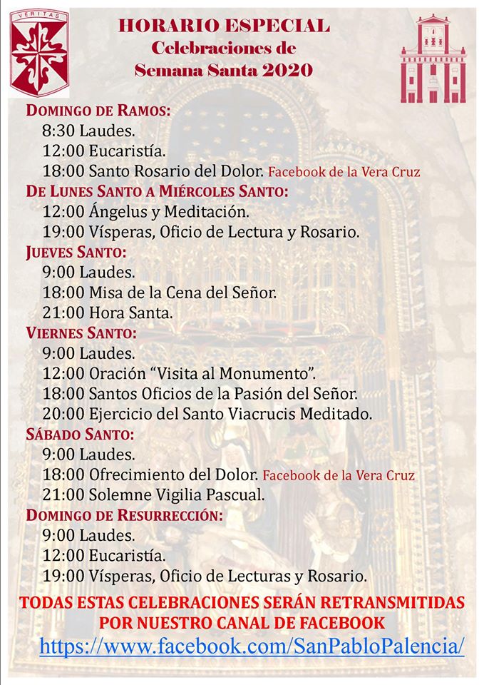 Con el fin de que podáis, en la medida de lo posible, vivir junto a nuestra comunidad conventual, los misterios de la Pasión, Muerte y Resurrección de Cristo, hemos preparado el siguiente programa de celebraciones que podréis seguir a través de este canal de Facebook.