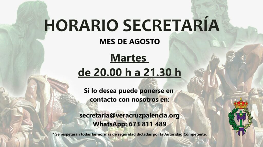 Por Vera Cruz PalenciaPublicado el Publicada en Información cofradeSin comentarios en Horario secretaría Agosto