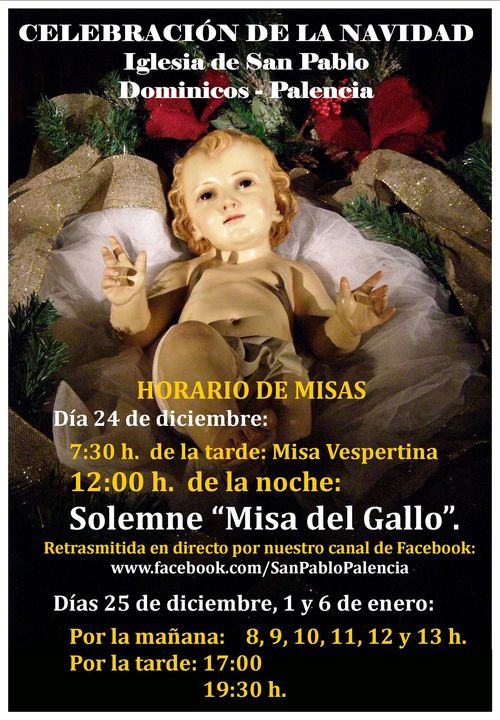 Os informamos de los horarios de las celebraciones en nuestra iglesia conventual de Pablo, para este tiempo de Navidad: